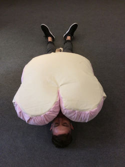 The jacket is made of canvas stiffened with buckram, with adjustable straps and buckles. Inside the plush fabric is stuffed to bursting in a shape that can be interpreted as breasts or buttocks. There will be performances with the jacket throughout the Private View, Friday evening and all day Saturday for the Final Show.